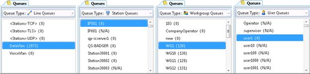 Use the Queue Type drop list to select interactions associated with a line, station, user, or workgroup queue. Interactions from that queue will appear in the Information display section of the view, along with interaction counts for each queue. The figure below shows examples of each queue type.