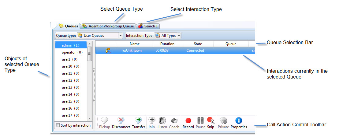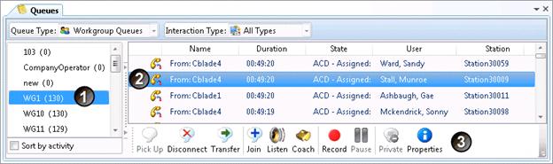 A queue is collection of interactions related to a user, station or workgroup. The Queues view allows a supervisor or manager to examine activity in line, station, user and workgroup queues. Interactions can be picked up, disconnected, placed on hold, joined, listened to, coached, recorded, or tagged as private. From this view, Agents can be given assistance with interactions in the different queues.