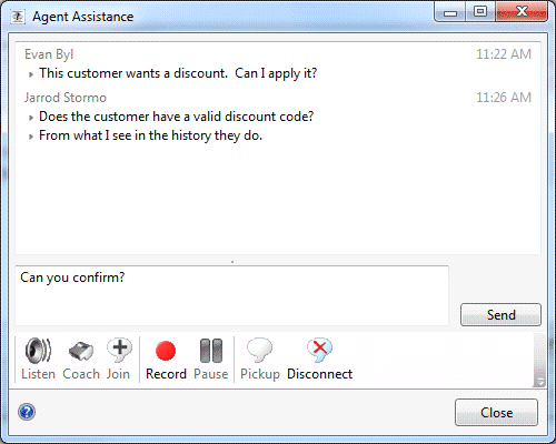 The Agent Assistance dialog is used when supervisors are assisting an agent.