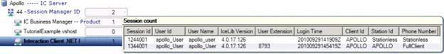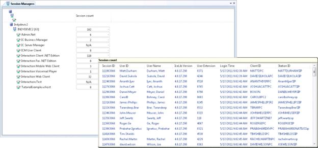 The view displays servers, session manager IDs, and products hierarchically. To use this view, expand the server, session manager, and product you want to examine. Products expand to display a list of current users. This makes it possible to see who is using the CIC clients or IC Business Manager, for example, at any point in time. |