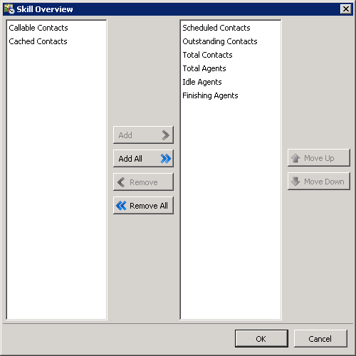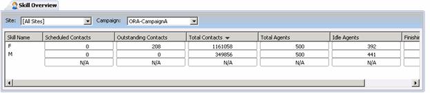 The Skills Overview displays skill summary statistics. This view helps supervisors manage skills-based dialing in predictive, power, and preview modes. It displays contacts by Skill Set to indicate which agent skills are needed. As with most views, you can click a column header to sort by that column.