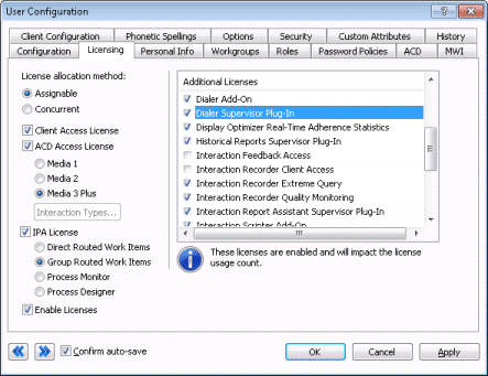 In the Additional Licenses list, check boxes for licenses that the user needs (see table above). For more information on configuring the Licensing page, press F1 to open the Interaction Administrator Help.