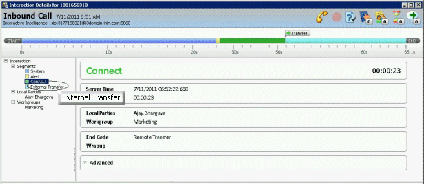 The system also stores interaction details for Call Transfers. Local and remote transfers can be examined in the Interaction Details dialog.