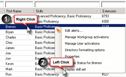 A right-click context menu item (Display Skill Set) displays the entire list of skills, their proficiency, and the desire to use them. If a user has the same skill in two different workgroups with different proficiency and desire to use, they both appear in the user skills dialog box.