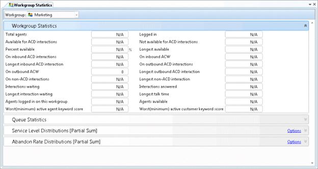 Selecting a different workgroup stops all statistic watches for the previously selected workgroup, and starts watches for the new workgroup. If the selected workgroup has no queue, expanders for Queue Statistics, Service Level and Abandon Rate do not appear. This view always contains an expander for workgroup statistics.