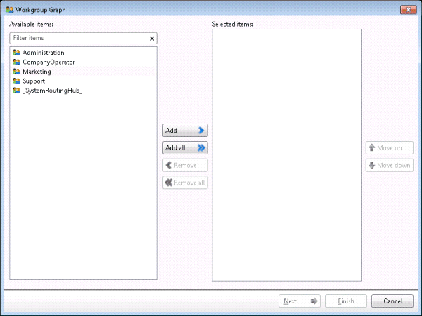 This dialog selects one or more workgroups for a view. You can filter the list of workgroup names by typing in the Filter box above the list of available items. To display additional items, you may need to type part of a workgroup name in the Filter box. When more than 20 workgroups exist in the system, only the first 20 are shown, and an indicator () informs that more are available. If you select more than 20 workgroups, an indicator (
