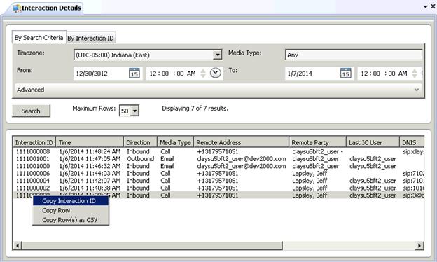 From the search results, select a single row and right-click to open the context menu: Copy Interaction ID, Copy Row, and Copy Row(s) as CSV.