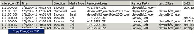 Interaction ID, Time, Direction, Media Type, Remote Address, Remote Party, Last IC User, DNIS, Last Workgroup, Connected Duration, Line Duration