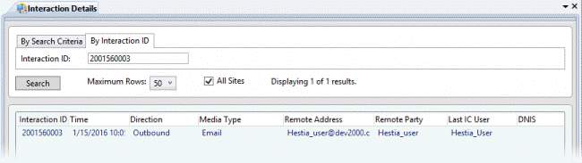 This topic explains how to use the Interaction Details view to find an interaction and examine its details. You can search by Interaction ID, which is a number that uniquely identifies an object of any media type, such as a telephone call, fax, callback, chat, and so on.