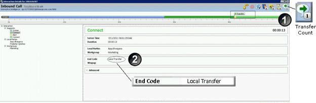 A Local Transfer indicates when the interaction is transferred within CIC. This is also applicable when more than one CIC servers is involved, for example, when agents are connected between different CIC servers. A local transfer is represented below. Notice that the Transfer icon has a count (callout 1) and also that there is an End Code (callout 2) for the segment which initiated the transfer. In this case the connect segment is transferred. The TransferCount includes only the Local Transfer happening in the system.