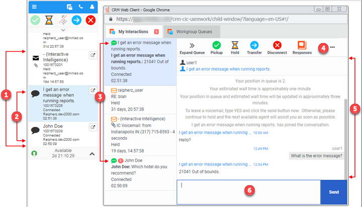 Active and expired chats display in one chat window as separate tabs. A red number indicates unread messages on active chats. Click a tab to make that chat the active chat. The chat window syncs with the interaction view in the softphone. |