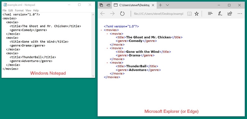 The figure below shows the sample movie database (sample1.xml) after it has been opened in Notepad and Internet Explorer. As you can see, Notepad displays the statements appear as they were entered. Edge and Internet Explorer display a tree of elements, which makes the content easier to view.