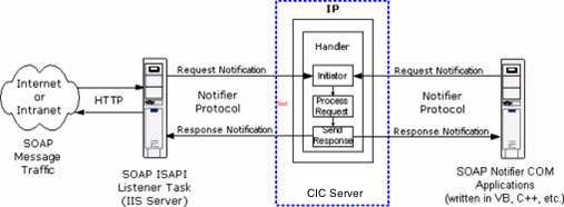 For the purpose of the SOAP implementation, message transport is not limited to any kind of protocol. SOAP requests are sent as notifications containing payload data as well as transport-specific out-of-band information. As HTTP is most frequently used as transport for SOAP requests through the internet, an ISAPI listener is provided (see SOAP ISAPI Listener Task for IIS). However, any kind of client who "talks" Notifier could issue SOAP requests. For example, a COM object that allows to directly send SOAP packets to CIC.